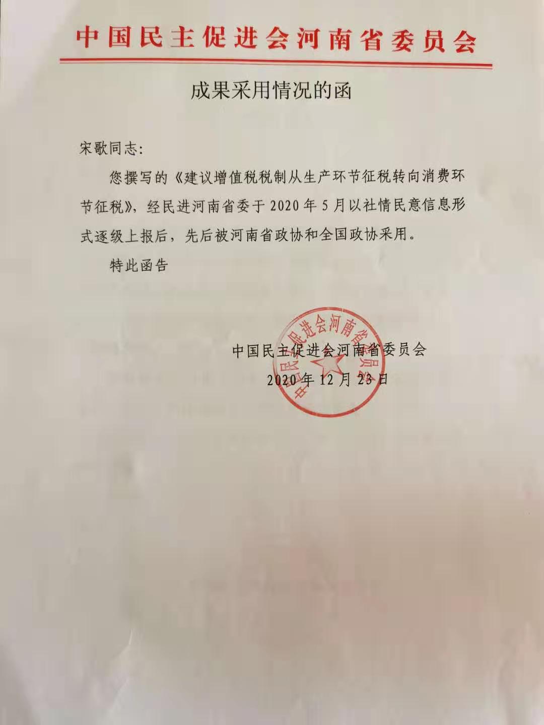 近日,从民进河南省委传来消息,KY开元集团官网民进会员宋歌老师撰写的《建议增值税制从生产环节征税转向消费环节征税》得到了全国政协和河南省政协共同采用。