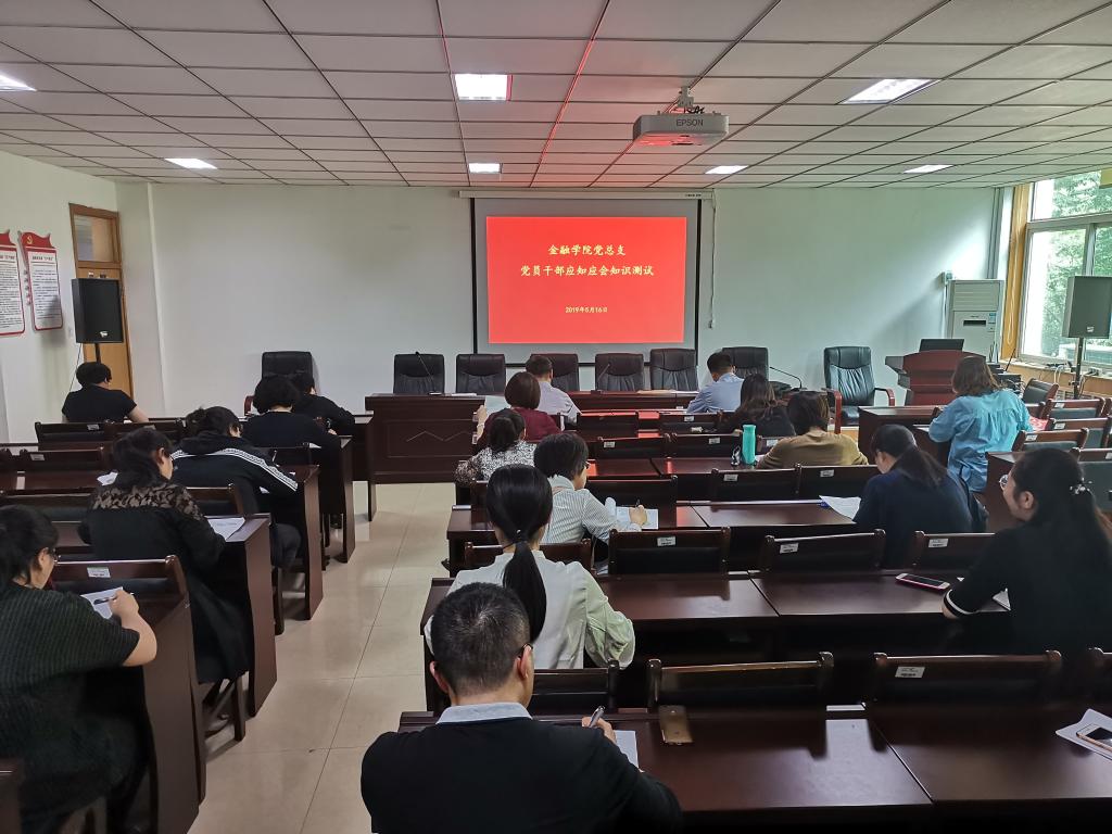 为深入学习宣传贯彻习近平新时代中国特色社会主义思想和党的十九大精神,不断提升党员干部政治理论素养和学习能力,按照学校《关于组织党员干部应知应会知识考试的通知》要求,金融学院党总支于5月16日下午2:30,在教学楼227会议室举办了党员干部应知应会知识测试。