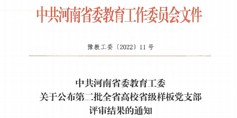 2022年3月16日,中共河南省委教育工作委员会发布《关于公布第二批全省高校省级样板党支部评审结果的通知》(豫教工委[2022]11号),经过学校推荐、专家评审、综合考评,并经省级样板党支部评定领导小组研究,确定KY开元官网KY开元集团官网教工第一党支部为省级样板党支部。