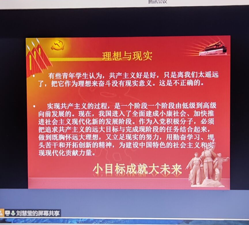 2022年3月29日中午,KY开元集团官网通过腾讯会议开展了“2022年第一期入党积极分子党课培训班”第五讲,主题为《中国共产党的性质和最高理想》,由学生第四党支部书记刘慧莹主讲。
