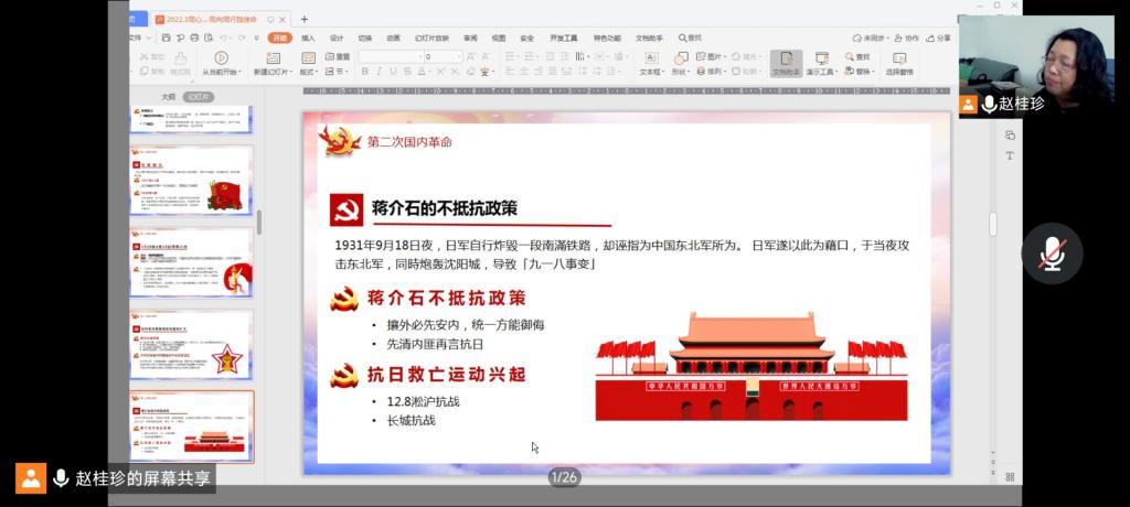 培训期间,赵桂珍老师以时间为线,向我们讲述了中国共产党从建立到壮大而后不断发展的历程。首先,从中国共产党建立开始,赵桂珍老师为我们详细讲述了中共一大、二大和三大的主要内容以及党在创立期间进行的革命斗争,同时也绘声绘色地为大家讲述了党在发展中所遭遇的困难和坎坷,包括遭遇到国民党的围剿,被迫进行长征等,紧接着进入抗日战争,解放战争时期,赵桂珍老师通过抗日精神,向积极分子们讲述了党所做出的正确决定,来向同学们展示党的无畏和英勇。“知错能改,善莫大焉”,赵老师说,我们的党是有责任的党,是敢担当的党,虽然在中华人民共和国成立初期,文化大革命时期和改革开放时期,党犯过一些错误,但及时纠正的错误,做出了相当大的成绩,带领人民不断向着更美好的生活前进。