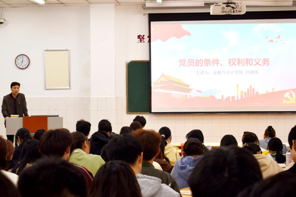 本讲内容主要包含“入党的基本条件”、“入党的动机”、“为什么要热爱党”、“党员的义务和权利”几个方面的重要内容。首先,汪书记向大家介绍了入党的五个基本条件,接着从三个方面介绍了青年大学生应具备的正确的入党动机,他强调,端正入党动机是保持党的先进性和纯洁性的思想基础,是端正入党行为的前提,是成为合格党员的起点。随后,汪书记以“为什么要热爱党?”为题,带领学员们共同回顾了党的百年光辉历史,从近代史的开端到新民主革命的兴起,再到新中国成立后取得的伟大成就,激励大家满怀信心地迈进新时代、开启新征程。最后,汪书记深刻解读了党员的八项义务和八项权利。他强调,党员履行义务,是党员在高度觉悟的基础上,为实现党的纲领,完成党的任务而自觉承担的责任;党员行使权利,是党员发挥维护党的利益的重要表现。每个党员既要认真履行义务,也要严肃正确地行使权利。他希望每一名入党积极分子都能够认真履行党员八项义务,牢固树立全心全意为人民服务的观念,以实际行动早日加入中国共产党。