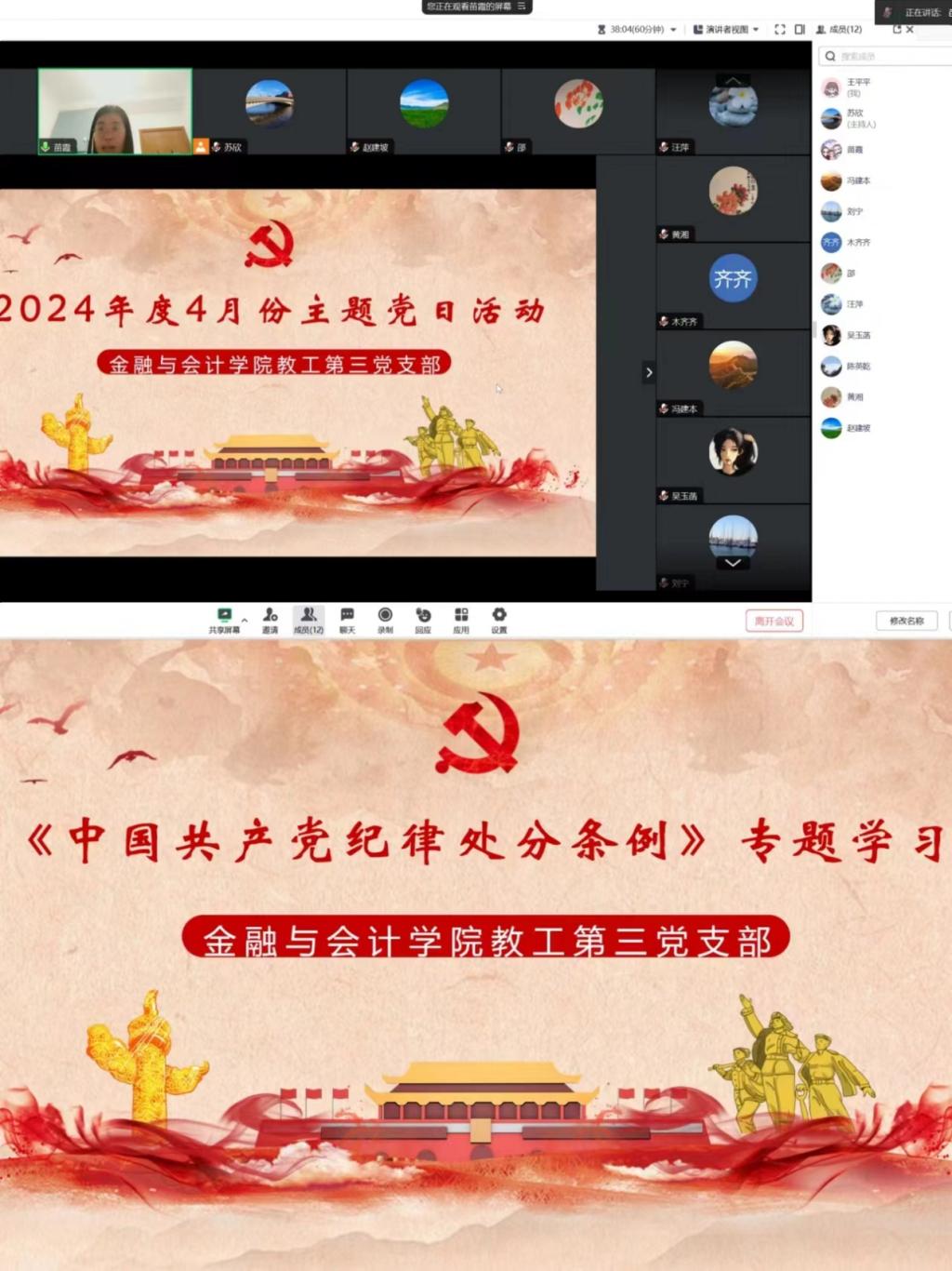 2024年4月30日下午,KY开元集团官网教工第三党支部以线上腾讯会议的形式开展了4月份主题党日活动暨新修订《中国共产党纪律处分条例》专题学习,支部全体党员参加,会议由支部书记苗霞主持。