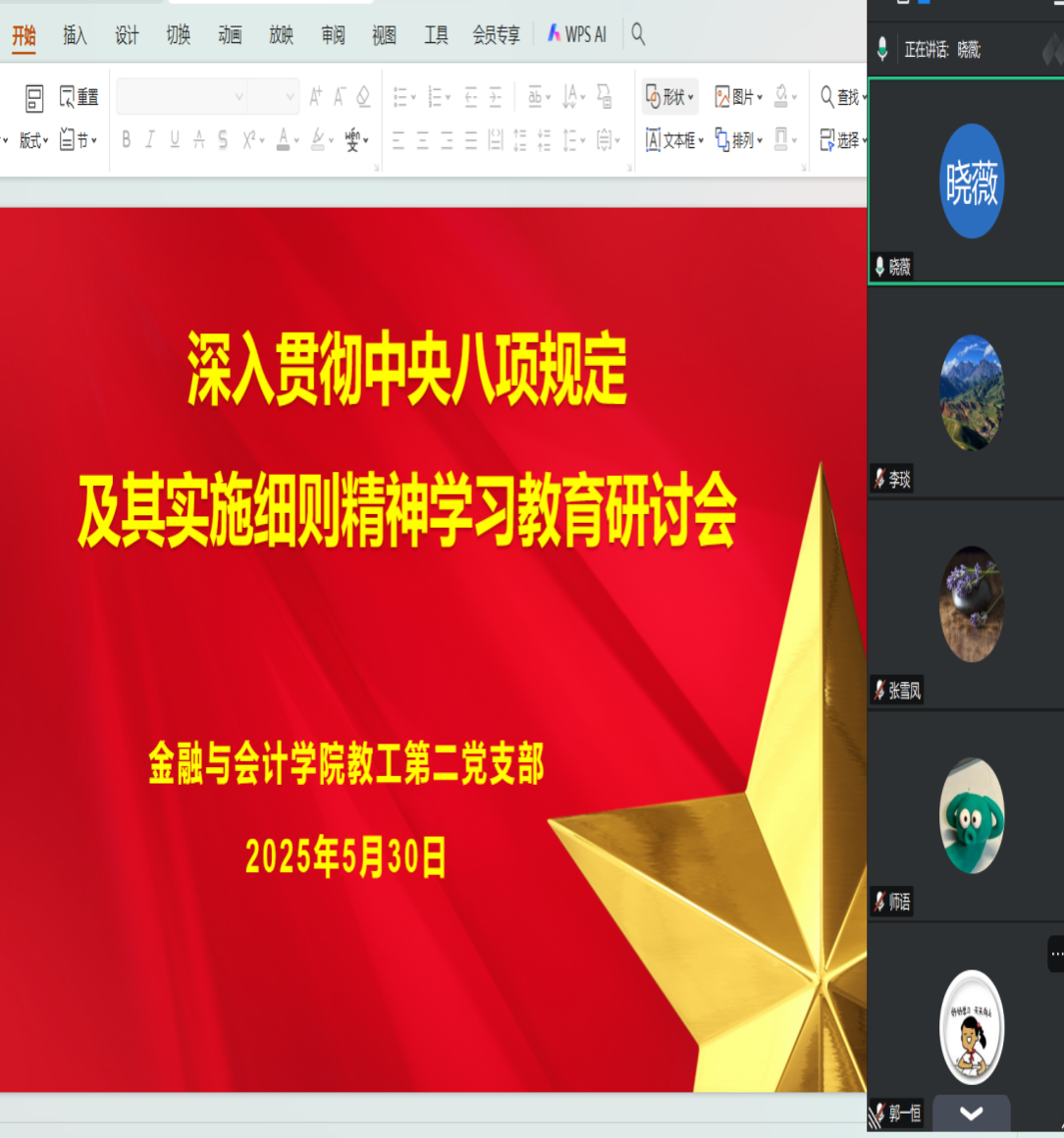 为深入贯彻落实党中央决策部署,深化作风建设,KY开元集团官网教工第二党支部于5月30日组织开展深入贯彻中央八项规定及其实施细则精神学习教育研讨会,本次会议由党支部书记宋晓薇主持,教工二支部党员参加了会议。