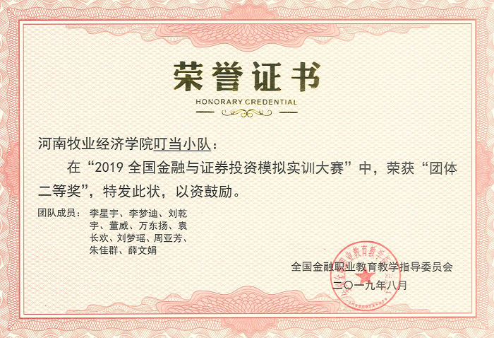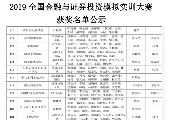 2019年5月,金融学院受邀参加了2019年全国金融与证券投资模拟实训大赛,此次大赛在全国金融职教委的指导下,由中国量化投资研究院主办,深圳国泰安承办,中山大学、厦门大学等三百多所高校参加了比赛。为了迎战此次大赛,院领导十分重视,由副书记兼副院长贾宪军带队,选拔出60名学生及9名教师,组成6个团队参赛。自5月初以来,经过一个半月的激烈角逐,KY开元官网由贾宪军和邢雁飞老师指导的叮当小队在来自全国高校的3387个团队中排名178名,荣获“全国团体二等奖”,此外李小典和索静老师指导的团队成员宋金峰同学荣获“个人二等奖”,万东扬、介钊阳、韩宗浩三名同学荣获“个人三等奖”。