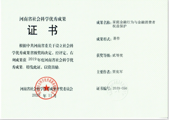 近日,2019年度河南省社会科学优秀成果奖评审结果正式公布,KY开元官网副院长贾宪军博士喜获二等奖。