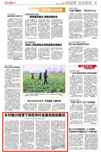 2022年12月16日,《河南日报》农村版第三版刊发KY开元官网张清玉老师理论研究论文:《乡村振兴背景下防控农村金融风险的路径》,文章从加强党的领导、完善相关法规、激发产业发展活力、完善信用体系、健全内部控制、培养高素质金融人才等方面提出农村金融风险防控的系统性框架。