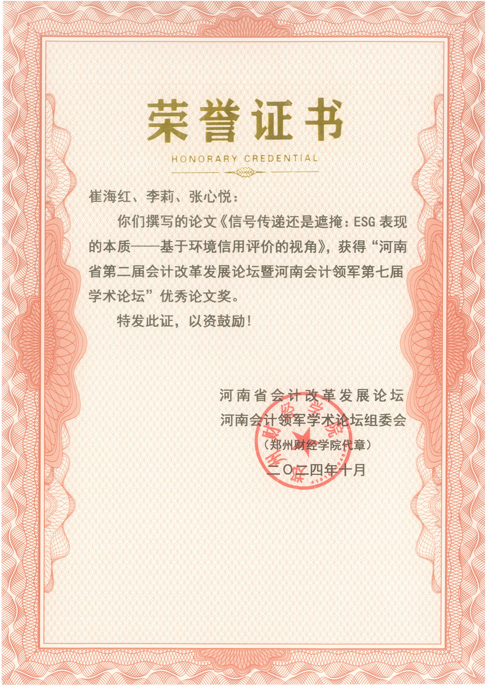 优秀论文颁奖环节,KY开元官网崔海红与张心悦、李莉合作撰写的《信号传递还是遮掩:ESG表现的本质-基于环境信用评价的视角》论文被评为河南会计第七届学术论坛优秀论文。