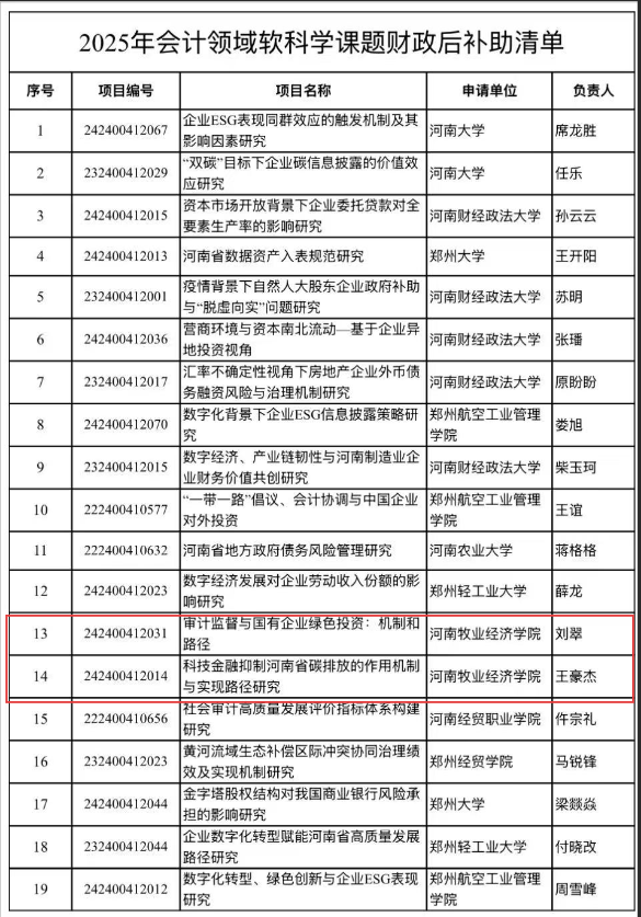 近日,2025年度河南省会计领域软科学课题财政资金后补助情况公示,KY开元官网刘翠博士的科研课题《审计监督与国有企业绿色投资:机制和路径》和王豪杰博士的科研课题《科技金融抑制河南省碳排放的作用机制与实现路径研究》获得财政资金后补助。