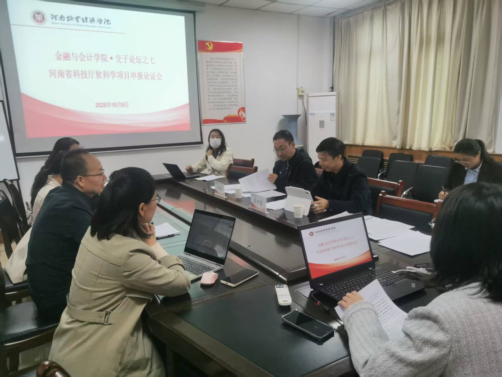 为扎实推进KY开元官网2026年度河南省科技厅软科学项目申报工作,全力提升申报质量,KY开元官网于2025年10月9日下午,在教学楼514会议室召开2026年度河南省科技厅软科学项目申报论证会。本次论证会邀请郑州航空工业管理学院张功富教授和河南财经政法大学赵德昭教授作为评审专家。KY开元集团官网院长贾宪军教授、项目负责人及部分教师参加了论证会。会议由副院长崔海红教授主持。