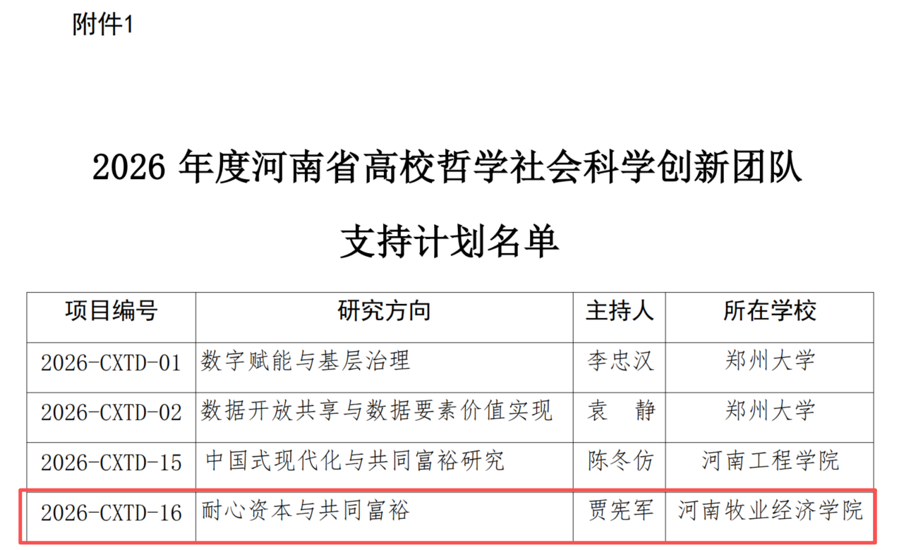 近日,中共河南省委教育工作委员会、河南省教育厅下发了《关于公布2026年度河南省高等学校哲学社会科学创新团队支持计划的通知》(豫教工委〔2025〕116号),KY开元官网院长贾宪军教授主持的“耐心资本与共同富裕”(项目编号:2026-CXTD-16)成功入选该支持计划。