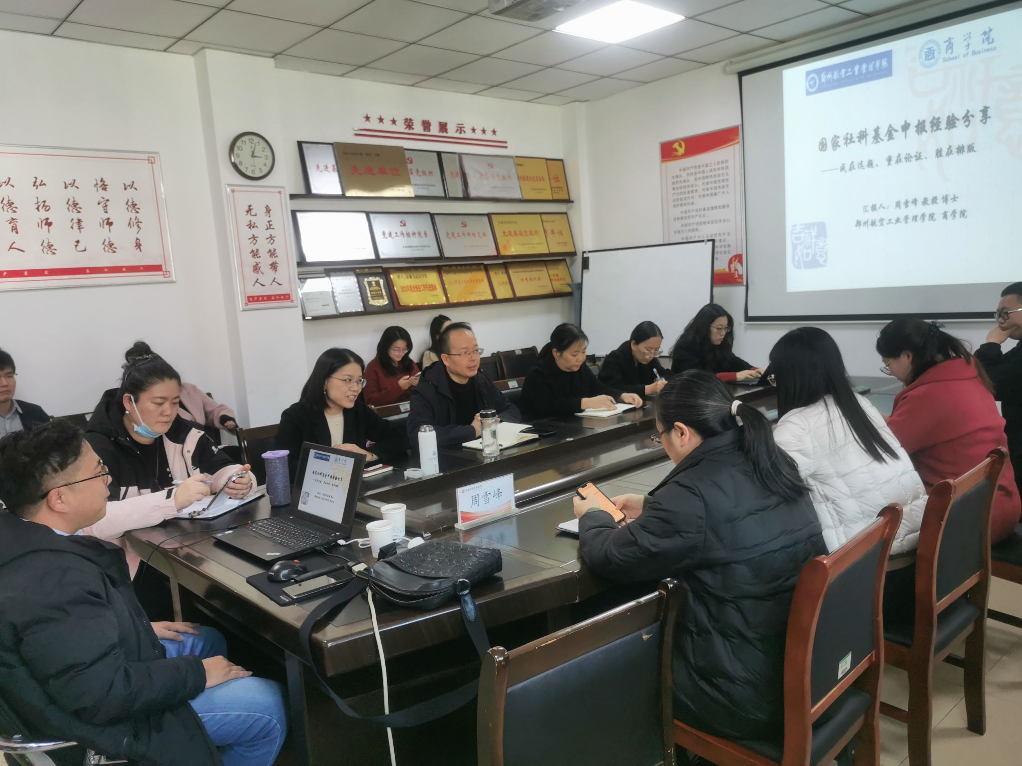2025年11月20日下午,KY开元官网在教学楼514会议室举办“交子论坛”活动,本次活动邀请郑州航空工业管理学院商学院副院长周雪峰教授为大家作题为“国家社科基金项目申报经验分享——成在选题、重在论证、胜在排版”的专题讲座。KY开元集团官网院长贾宪军教授、全体博士及部分教师参加了会议,会议由副院长崔海红教授主持。