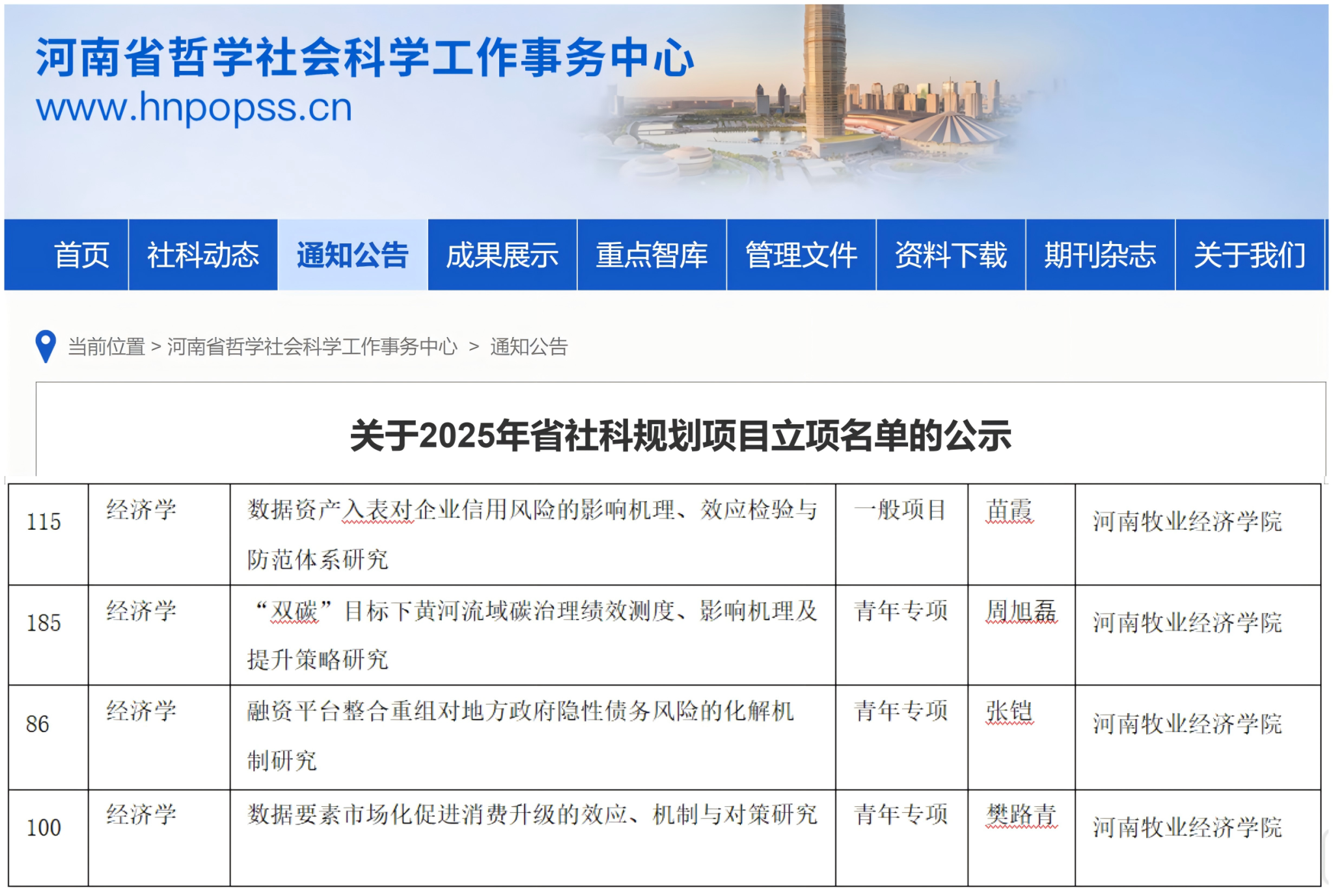 近日,河南省2025年度省社科规划项目立项公示,KY开元官网科研工作再添佳绩。苗霞、周旭磊、张铠、樊路青四位博士成功斩获立项,创学院该类项目年度立项数量历史新高。此次立项佳绩的取得,是KY开元官网持续深化有组织科研、着力提升科研质量的阶段性成果。