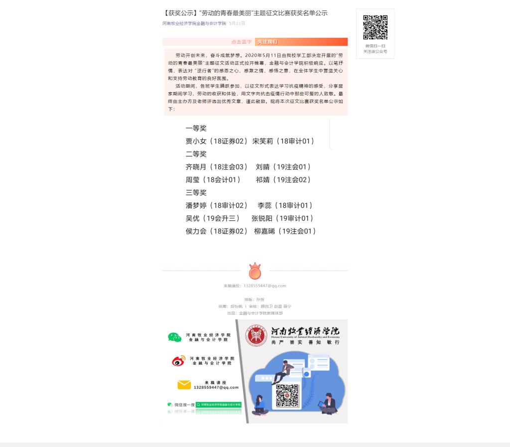 此次活动面向学生弘扬劳动精神,组织开展以“劳动的青春最美丽”为主要内容的活动,形式丰富多样,有助于提高同学们的参与热情,有利于学生从中学习与传承劳动精神。一是学习《意见》研讨交流活动。5月11日起,各班班长组织学生以班会、讨论会等形式进行线上交流,同学们纷纷表示,在学好专业课的同时,也要主动参加其他有益于身心健康的劳动,培养爱劳动的好习惯。学院通过微信公众号平台发布《重磅!中共中央、国务院发文,全面部署新时代大中小学劳动教育》文章,广大师生通过网络媒体平台学习《意见》全文,领会《意见》精神。二是学习抗疫精神活动。5月18日至5月24日,同学们在线上学习一线抗疫英雄的奉献精神和无畏精神,有利于帮助同学们更加积极的学好专业课程,为以后实现自身价值打下坚实基础。三是开展居家劳动实践活动。5月11日至5月17日,同学们积极参与到活动当中,纷纷上传在家的劳动成果,此次活动展现了同学们的劳动与智慧,提升了学生的综合素质,增强了劳动意识,有利于促进学生全面发展。四是开展主题征文活动。5月11日起,同学们用文字向抗击疫情行动中那些可爱的人致敬,激发了大家对学习、生活的热爱,增强了同学们的责任感,意识到每一位平凡的劳动者背后的伟大,此次征文活动提升了同学们的精神文明和道德修养。五是开展文艺作品评比活动。活动于5月11日至5月17日进行,同学们踊跃参与到此次活动当中,用精心准备的作品表达了对劳动者的敬意,充分展示了当代学生良好的精神风貌和文化素养,有利于弘扬劳模精神,激发同学们的劳动热情。