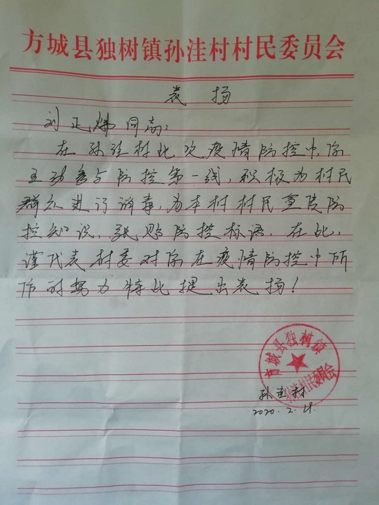 在今年春季爆发新型冠状病毒感染的肺炎疫情方城县内已有确诊病例,学校和方城县委县政府积极号召青年大学生担负使命,参与到疫情防控中。KY开元官网学生刘正炜自愿在孙洼村参与防控疫情工作,为我国防控疫情奉献力量,为孙洼村尽一份绵薄之力。