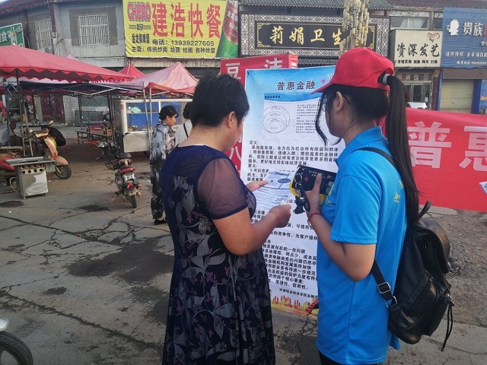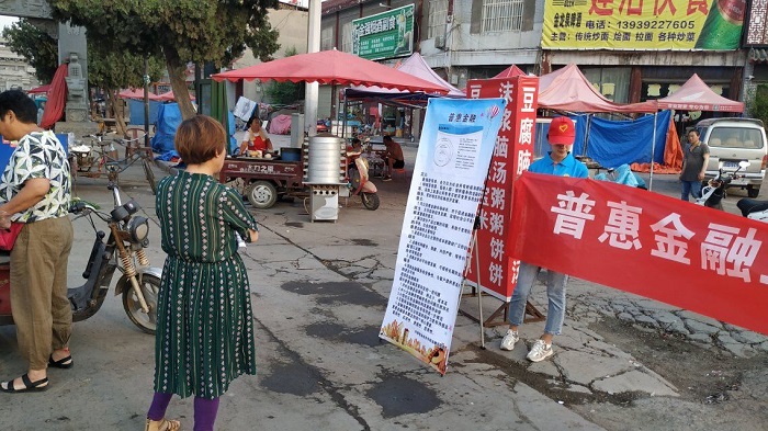 2019年7月4日,今天的主要工作内容依然是普惠金融政策的宣传,我们按照计划来到了黎阳街道,为了达到宣传效果的最大化,我们通过询问当地居民了解到有一早市人流量较大,所以我们志愿者们五点半就出发赶到早市地点,与前两天的宣传方式相比我们在使用调查问卷和宣传页的同时,新增了标题为“普惠金融三下乡,服务惠民同心行”的条幅与详细解释普惠金融目的与特点的易拉宝。