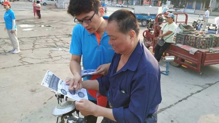 因为本次活动对场地有一定的要求,经过反复斟酌,在不影响附近商贩做生意的情况下,我们最终找到了合适的工作区域。我们的条幅与易拉宝吸引了很多人驻足,志愿者们积极为人们介绍我们的宣传内容,回答人们的问题。逛早市的人群以五十岁以上为主,志愿者们根据这一情况选择普惠金融中与老人生活紧密相关的内容作为今天早上宣传的重点。
