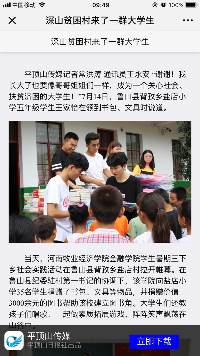 在为期十天的社会实践过程中,志愿者们得到了当地村党政干部的大力支持,得到了村民们的热情招待,更为可喜的是服务队的实际行动引起了平顶山日报的关注,并对志愿者们的实践活动进行了报道,在当地获得广泛好评。