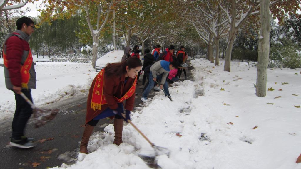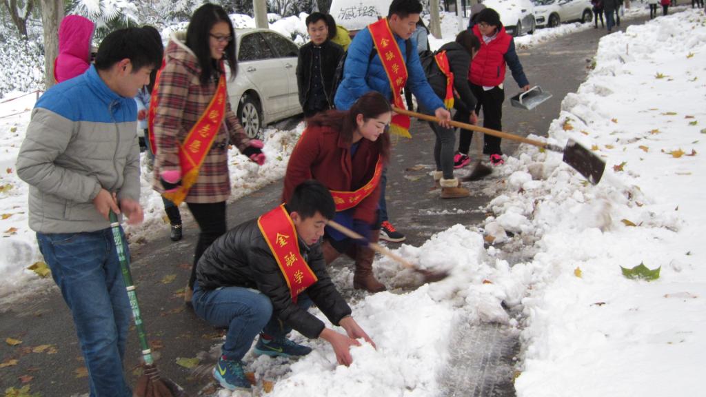 瑞雪兆丰年。入冬以来的第一场大雪不期而至,在大家忙着拍照分享美丽雪景、惬意心情的同时,面对积雪严重的校园道路,为了师生的出行通畅与安全,响应校青年志愿者协会的倡议,金融学院青年志愿者们积极行动起来从卫生责任区开始,清除临近主干道的积雪。