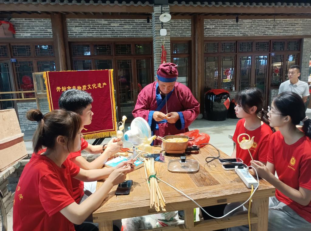 7月8日起,追光实践队正式开始对非遗文化项目和非遗匠人展开调查寻访。通过探寻国家级非物质文化遗产西姜寨盘鼓的踪迹,深入接触盘鼓文化,使队员们有了新的文化体验,为盘鼓文化进入校园打下了基础。实践队还有幸拜访了开封孟氏吹糖人——孟宪伟先生。吹糖人是一项极具有民俗特色的手艺,其拥有悠久的历史,被列入非遗文化。孟师傅在先辈的基础上赓续传承并融入现代元素进行技艺的创新,也为年轻人提供了更多关注和热爱非遗的理由。追光实践队还拜访了中国书法家协会会员,宣和印社副社长,著名书法家、篆刻家刘建国老师。刘老师通过实物展示和生动的解说,将篆刻的基本步骤娓娓道来,让同学们对原本陌生的篆刻艺术产生了强烈的共鸣,也深深感受到非遗技艺薪火相传背后的匠人精神。