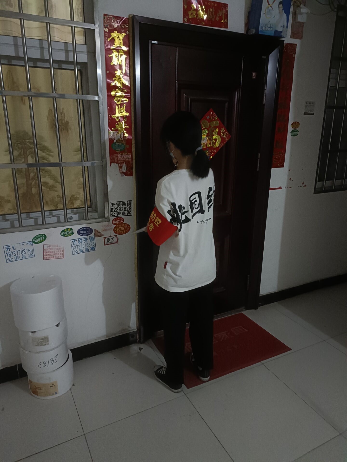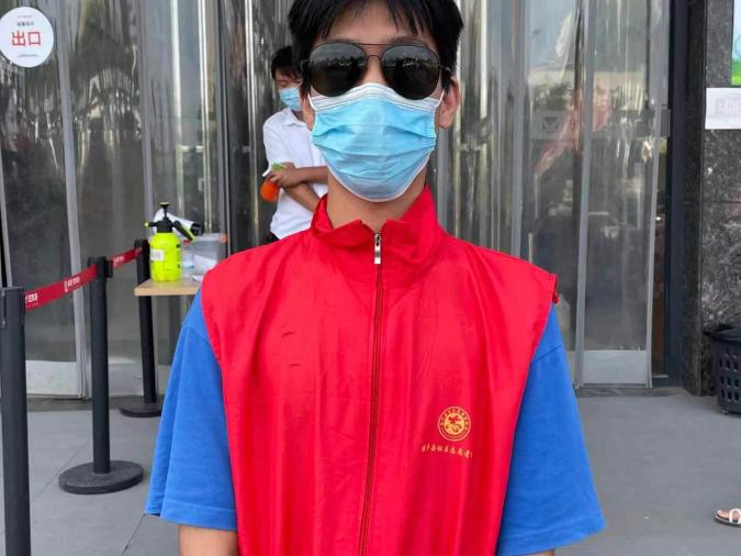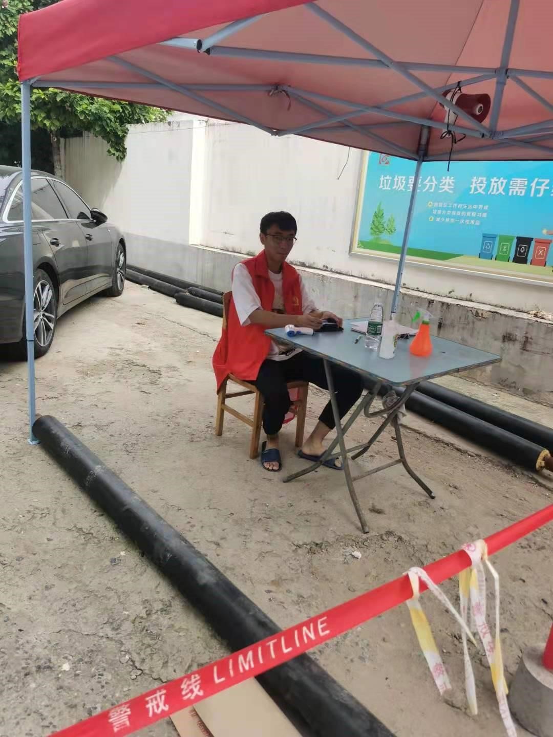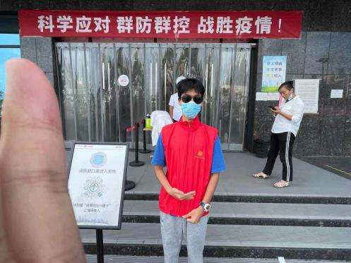在经历了特大暴雨灾害之后又迎来了新的挑战,出现了新冠病毒的变异体。为第一时间响应号召朱炳森同学主动加入志愿服务,他每天的工作内容就是在小区出口处卡点,检测来往人员的体温,并做好相关的记录,对进出的车辆进行严格排查,对来往人员进行酒精消毒。