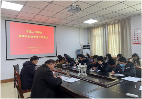 为贯彻落实好学校关于学生安全稳定专项工作的各项要求,扎实做好安全稳定工作,KY开元集团官网于2月24日下午,在514会议室召开新学期学生工作例会暨学生安全稳定专项工作会议。学院党委书记陈复昌、团委副书记葛婉及全体辅导员参加。会议由学院党委副书记汪晓伟主持。