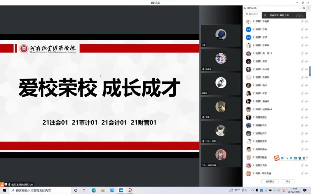 首先,各班代表同学发言回忆并交流自己的求学之路与母校、老师之间结下的深情厚谊,真情实感的流露让大家充分认识到学校发展与个人成长是相辅相成的关系。接着,各班辅导员分别结合本班情况充分讲解主题内容,对同学们进行了校史教育,使学生了解校史校情,增强学生的爱校荣校意识,激发学生自信心和自豪感,进而使学生自觉践行校风校训。此外,辅导员老师还和同学们分享了部分优秀校友的成才成长经历,他们在校期间努力学习,奋发有为,参加工作后时常心系母校,为母校的繁荣发展建言献策、捐款捐物,广大校友用实际行动感恩回馈着母校。老师们叮嘱大家要把学习作为首要任务,规划好自己的大学生活,树立远大目标、立志成长成才,在奋斗的路上实现自我价值!最后,各位辅导员老师给同学们强调了现阶段疫情防控形势的严峻性及做好疫情防控的重要性,要求同学们严格遵守学校疫情防控规定,坚持每日健康打卡,非必要不出校,加强自我防护,积极配合学校防疫工作。