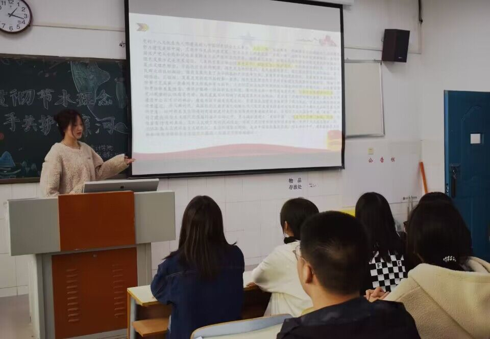 伴随着嘹亮的团歌声,各团支部组织的团课相继开展。在本次团课中,各团支部积极引导同学们就领会习近平生态文明思想,贯彻节水理念,保护母亲河等相关方面开展讨论,表达自己的看法和想法。本次团课不仅让同学们学习了“节水优先、空间均衡、系统治理、两手发力”的治水思路,还让同学们深刻领会了“水资源、水生态、水环境、水灾难”统筹治理新思路。
