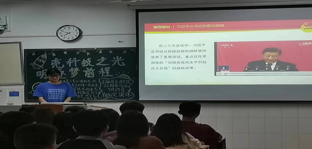 伴随着嘹亮的团歌声,各团支部组织的团课相继开展,在本次团课中,同学们积极分享对科技创新的认识,就如何以科技之刃,辟未来之路发表自己的见解。随后学习了习近平总书记对科技创新的战略擘画,以及党的二十大中关于“加快实现高水平科技自立自强”的战略部署。本次团课引导同学们继承和发扬钱学森、邓稼先、袁隆平等老一代科学家艰苦奋斗、科学报国的优秀品质,为我国的科学事业发展,为创新型国家建设,为中华民族伟大复兴做出自己最大的贡献。
