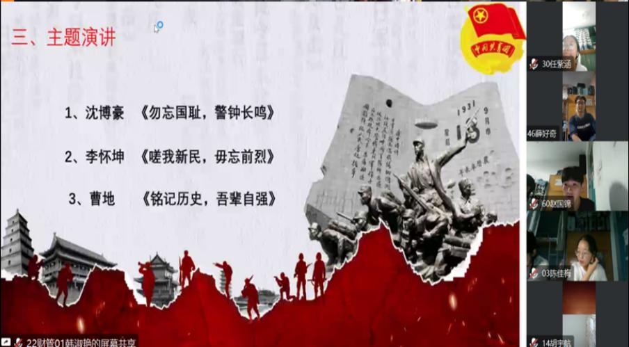 伴随着嘹亮的团歌声,各团支部组织的团课相继开展。尽管是线上团课,同学们依旧坚定严肃。在本次团课中,各支部首先组织各班团员深切了解“九一八事变”的历史背景及意义,增强了同学们的爱国热情。然后通过主题演讲、主题问答等环节使同学们进一步了解“九一八事变”的全过程和原因,激起了同学们铭记历史,昂扬向上,奋发学习的斗志。最后团支书通过图文资料向大家揭示了当年日本侵略者卑劣野蛮的行径,警醒所有同学要牢记历史,以史为鉴。