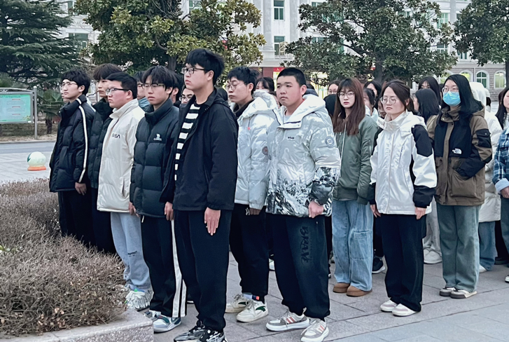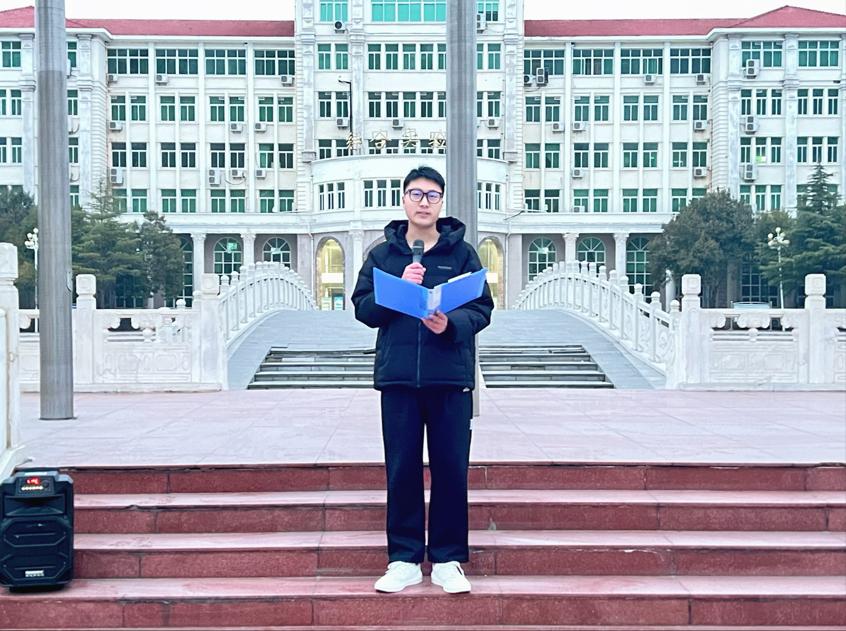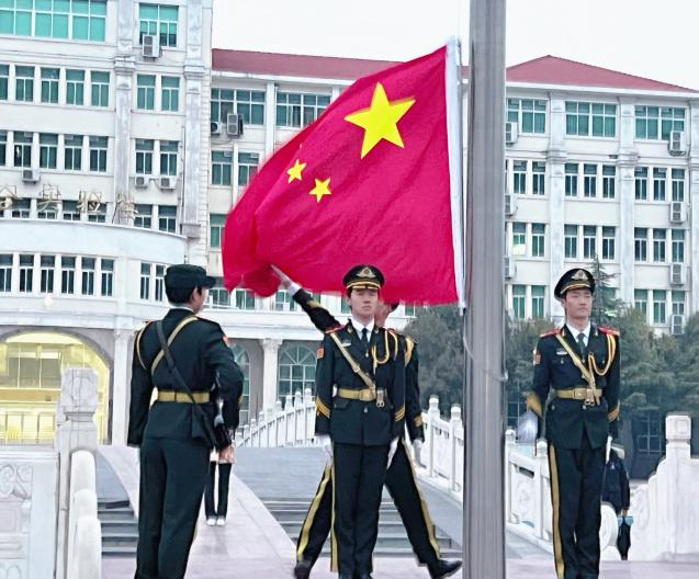 朝阳喷薄欲出,青年整装待发。仪式开始,国旗护卫队昂首阔步而行,口号响亮、步调整齐,伴随着雄壮激昂的国歌声,五星红旗冉冉升起,全场师生肃立注目,奏唱国歌。