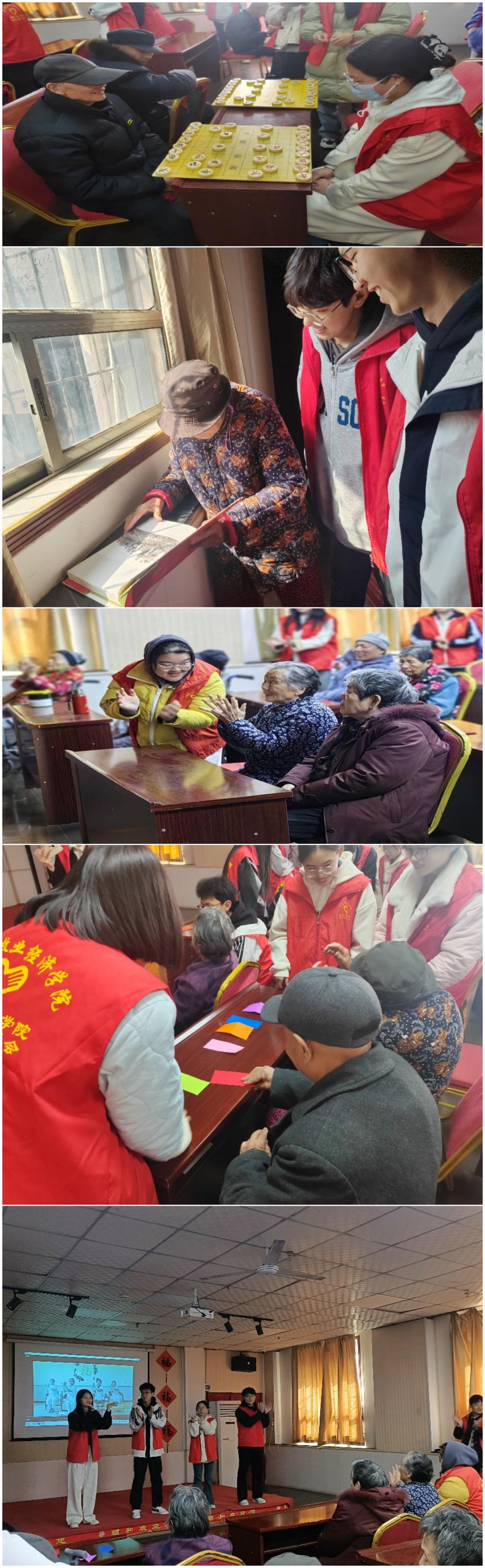 在到达现场后,志愿者们首先带领老人们做拍手操锻炼身体,活跃气氛,考虑到部分老年人视力不好的情况,志愿者们进行示范与老人一起活动关节,以促进血液循环,强身健体。之后有同学与老人下棋切磋,聊天解闷,增加了他们的生活乐趣,使他们的脸上洋溢着温暖的笑容。