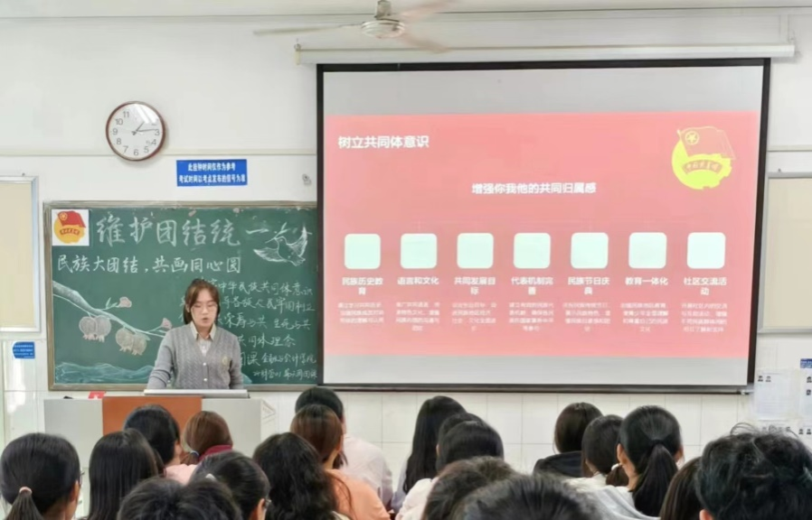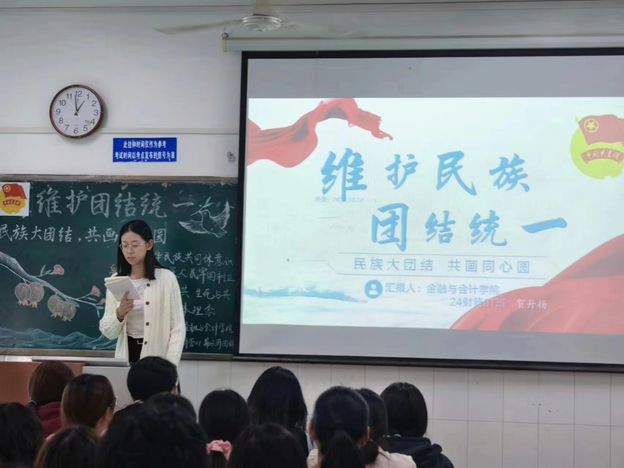 “我们是五月的花海,用青春拥抱时代……”伴随着团歌的响起,此次团课活动正式开始。首先,各团支书向同学们阐释了“石榴籽一家亲”的具体概念,向同学们讲述了习近平总书记关于加强和改进民族工作的重要思想。接着通过播放影片和理论宣讲,以鲜明的事例让同学们认识到民族团结的重要性。最后,各团支书强调了青年大学生作为时代的先锋,应深刻认识到各民族之间应树立休戚与共、荣辱与共、生死与共、命运与共的共同体理念,铸牢中华民族共同体意识。