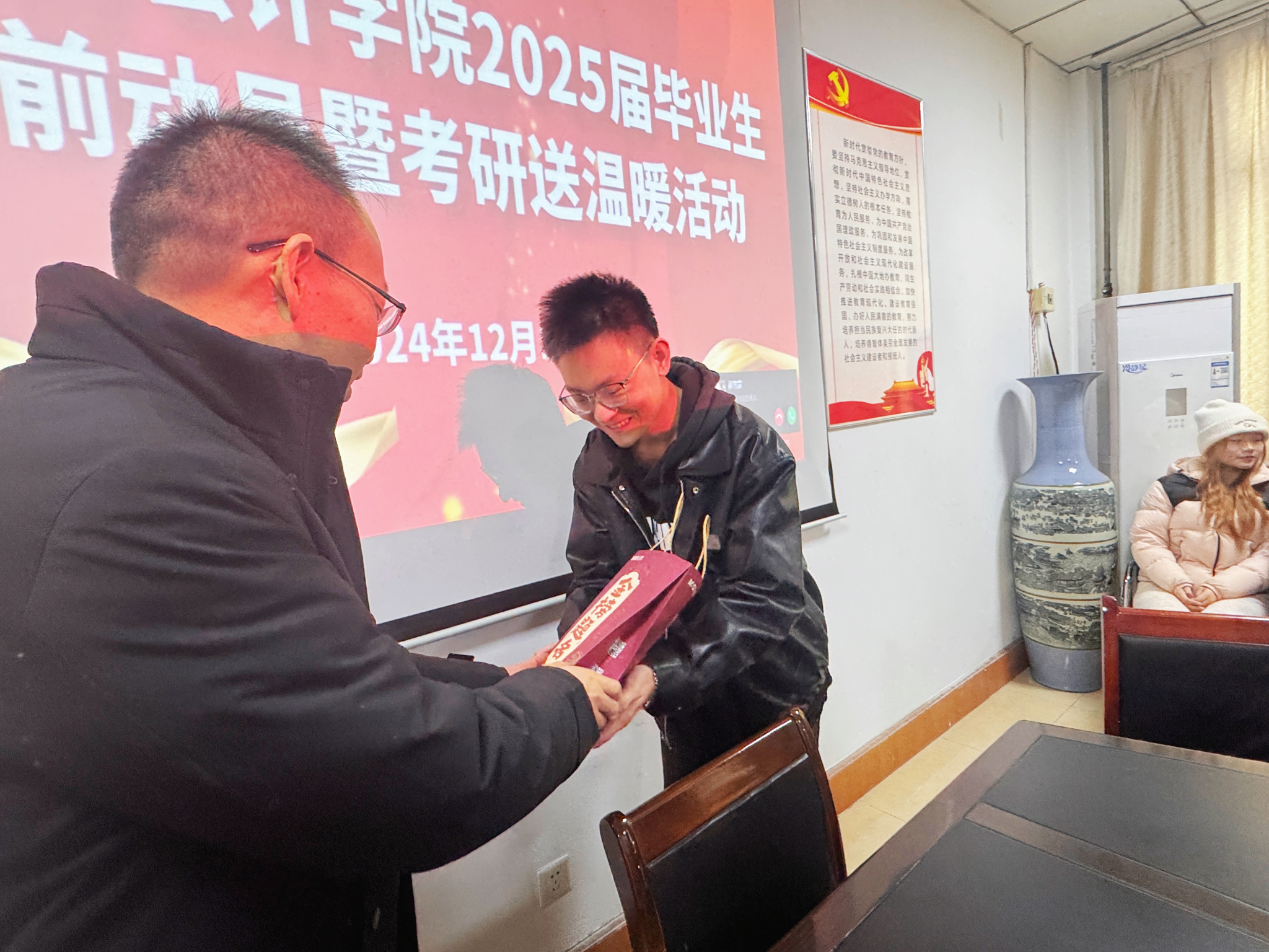 最后,贾院长及各位老师为同学们分发了学院精心挑选的礼物,这些礼物承载着学院对学子们的殷切期望与关爱,寓意着同学们“考试顺利,能量满满”,让同学们在寒冬中感受到了浓浓的暖意。相信在学院的关怀与鼓励下,KY开元官网2025届考研同学定能取得优异成绩,为自己的未来开启崭新的篇章。