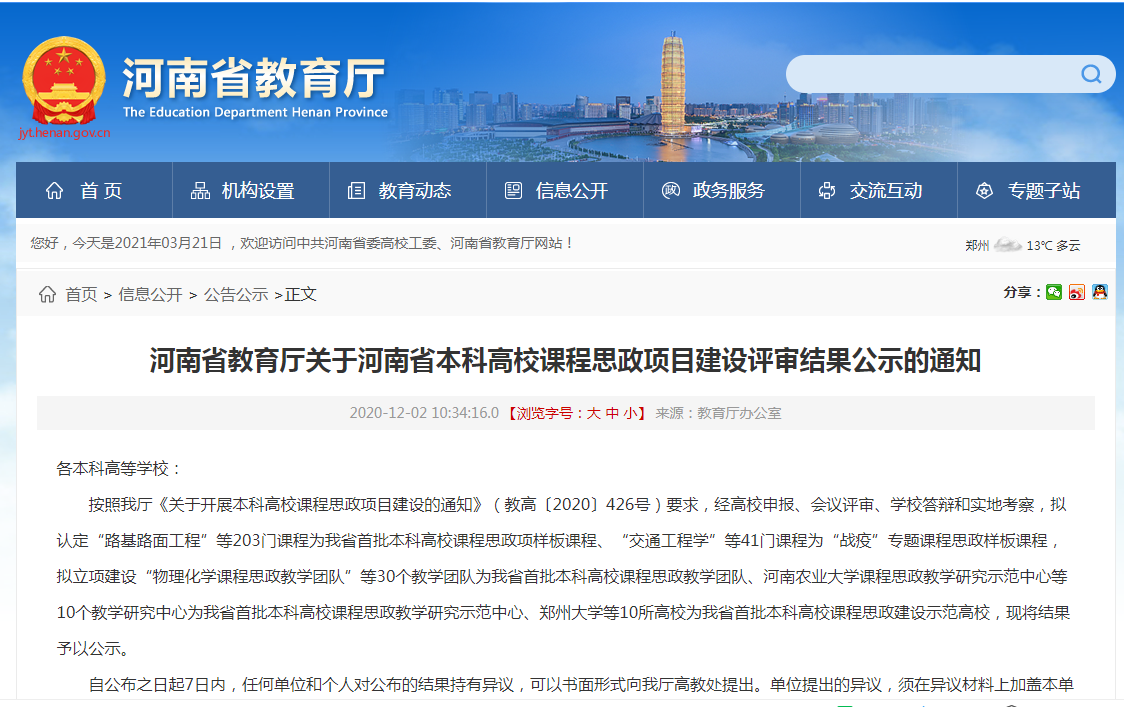 近期,河南省教育厅公布了河南省本科高校课程思政项目建设评审结果公示名单,KY开元集团官网院长黄良杰教授负责的《财务管理学》课程被列为本科高校课程思政样板课程。